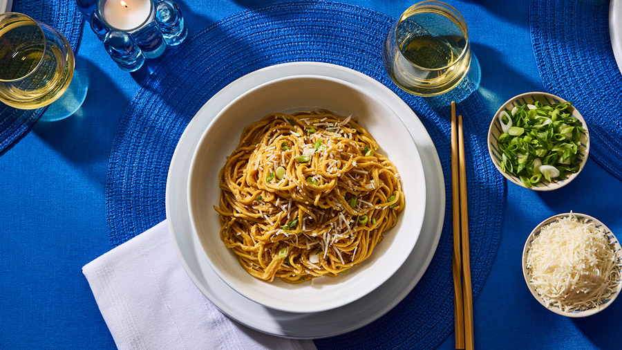 Mettez les nouilles dans la sauce et mélangez à feu doux pour les enrober. Ajoutez de l’eau de cuisson des pâtes si nécessaire pour obtenir la texture souhaitée. Incorporez le parmesan. Finissez avec des oignons verts et du parmesan en plus.