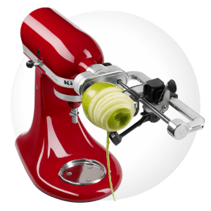 Fixez l’accessoire taille-légumes en spirale sur le robot pâtissier multifonction KitchenAid. Placez le concombre au centre de la brochette à fruits et légumes rattachée au taille-légumes. Fixez la lame pour trancher en spirales fines, et positionnez-la à l’extrémité du concombre.