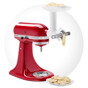 Fissare il set per biscotti al robot da cucina, selezionare lo stampo rotondo e inserire l'impasto per biscotti nel tubo alimenti. Raccogliere e disporre l'impasto su una leccarda rivestita di carta da forno e tagliare ogni striscia in cilindri di 7 cm.